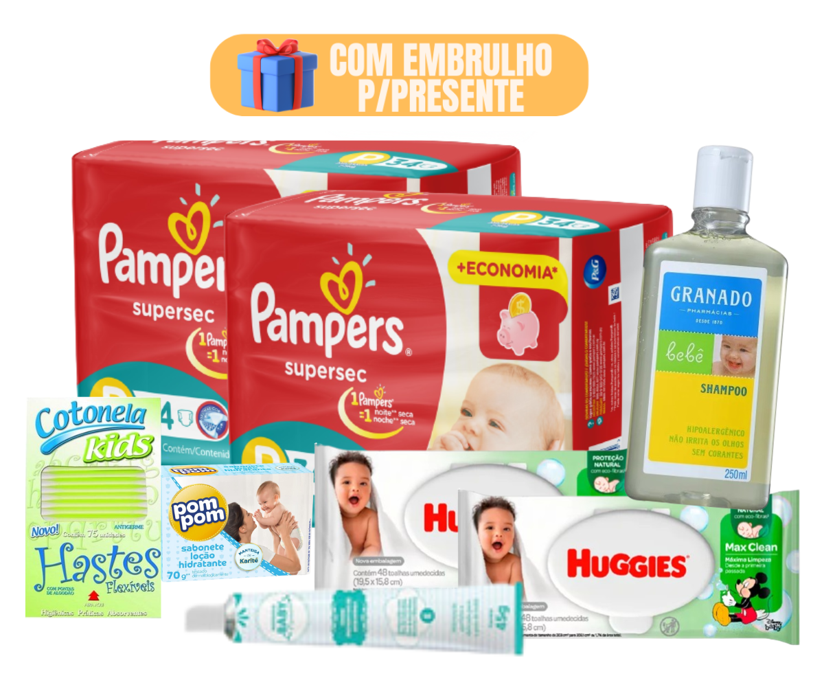 Kit Chá de Bebê Premium 2 Pampers e Granado Lenço Umedecido Shampoo Com Embrulho